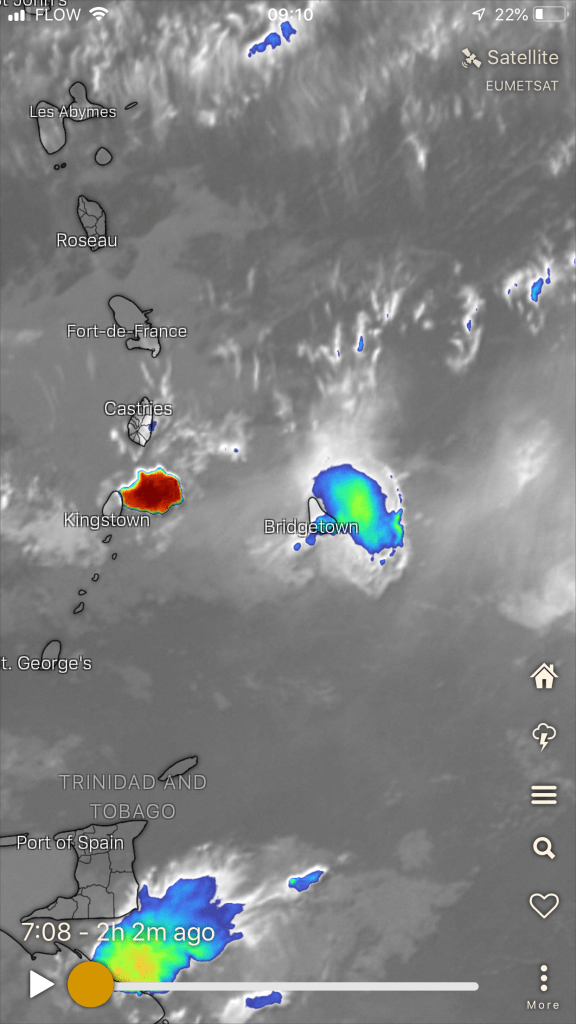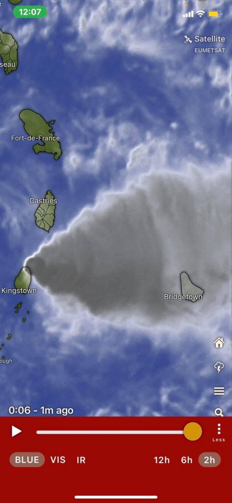 As far as La Soufriere is concerned, she finally slowed down about six days after the first eruption. It’s not over though, as we are repeatedly being told. It’s just that she’s lost some of her energy and her eruptions are not reaching the high-level air streams that carry the ash east over to Barbados. Instead, it is being blown west into the Caribbean Sea by the surface winds that travel from east to west.