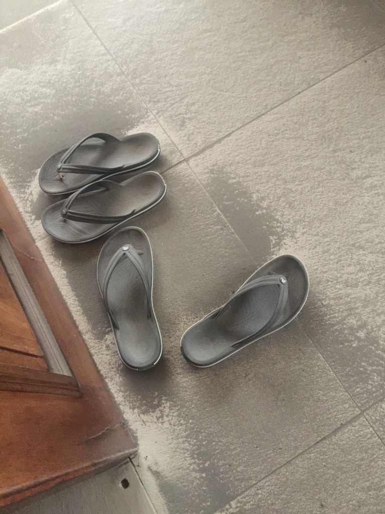And now I know. Saturday we woke up to more darkening skies. The sun could barely peek through the ash-laden clouds that filled the sky. More massive explosions had occurred overnight and in the early morning. Neither of us heard or felt anything but we didn’t sleep well. Dogs were barking and howling on and off all night and M was calling out in his sleep, dreaming that ash was falling on him, every time the mosquito net brushed against his leg. As the morning progressed, a soft film of dust was settling over anything outside, and we decided to move indoors.